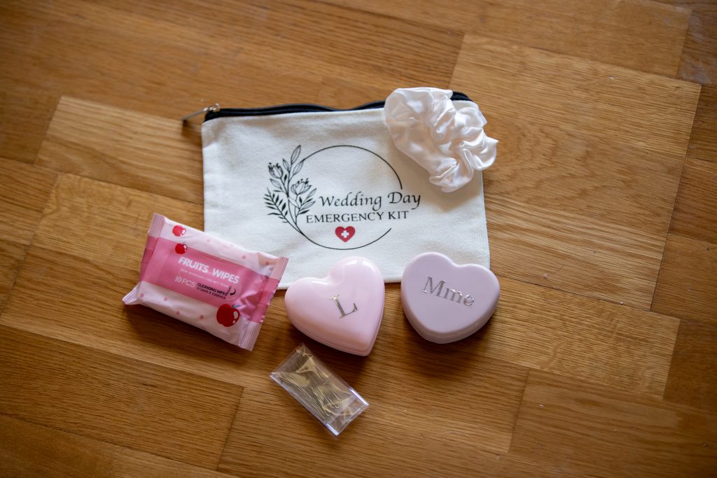 Découvrez notre pochette spéciale « kit d’urgence mariée », conçue pour que la reine de la journée soit prête à faire face à chaque petit imprévu. Ce kit contient :
